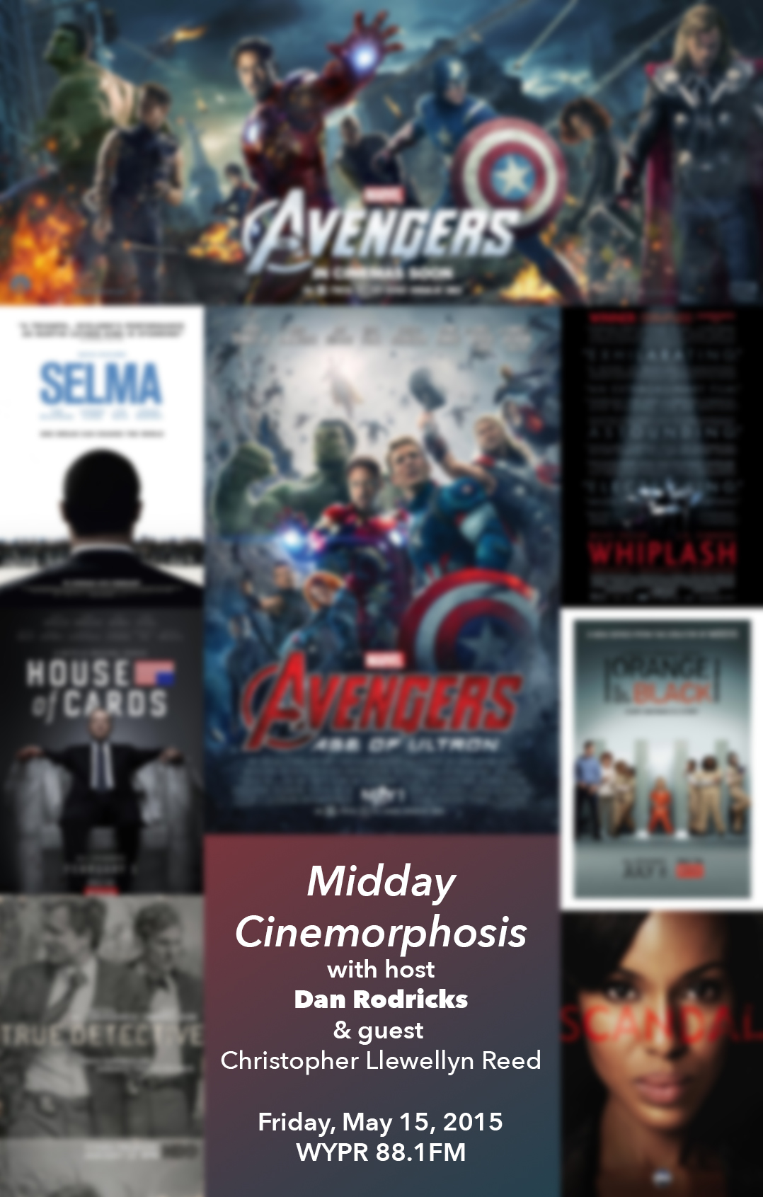 Join host Dan Rodricks and me, Midday film critic Christopher Llewellyn Reed – Chair and Professor, Department of Film/Video, Stevenson University – on Friday, May 15 – the day another franchise releases a new film, Mad Max: Fury Road – at 1pm, as we discuss the changing nature of moving-image entertainment. Which films do you like to watch in theaters? Do you even still go out to the movies? What television/cable/streaming series do you like to watch, and why? Tune in to hear what we have to say, and add your own voice to the conversation by listening live and emailing your comments and questions to midday@wypr.org, or by calling in at 410-662-8780 (locally), or toll-free at 1-866-661-9309. If you can’t listen locally, you can live-stream the show on-line. If all else fails, you can always download the podcast afterwards, either via iTunes or the Midday page.