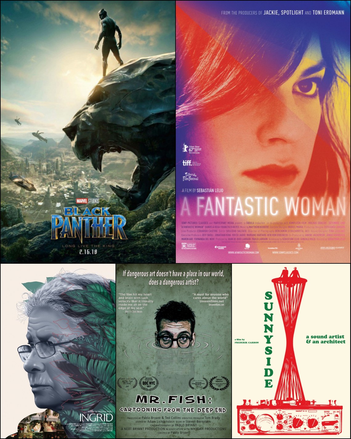 This past week, Film Festival Today ran one review of mine – of Black Panther– and Hammer to Nail ran four, of A Fantastic Woman and three more Slamdance films: Ingrid, Mr. Fish: Cartooning from the Deep End and Sunnyside. Here are links to all 5 pieces: